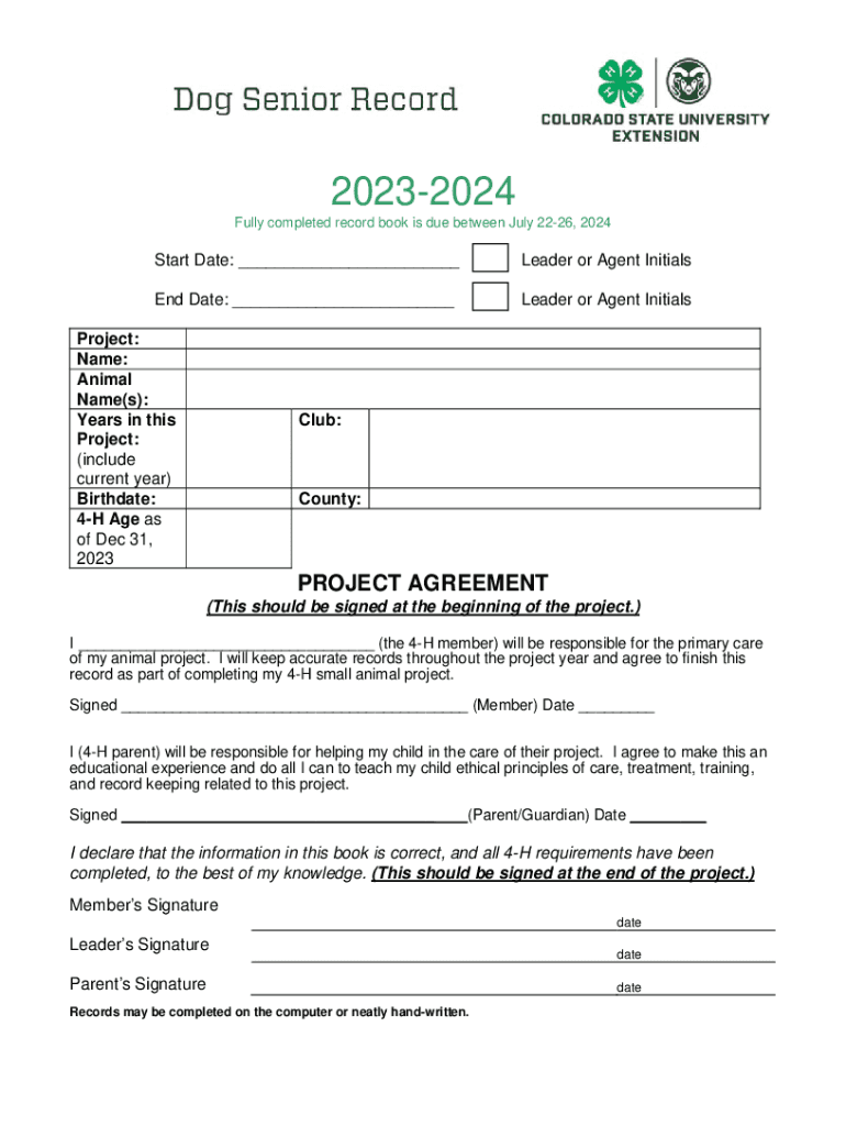 20232024 Fully completed record book is due between July 2226, 2024Start Date: ___Leader or Agent InitialsEnd Date: ___Leader or Agent InitialsProject: Name: Animal Name(s): Years in this Project: