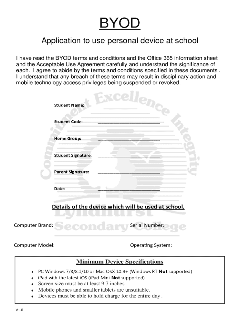 BYOD Application to use personal device at school I have read the BYOD terms and conditions and the Office 365 information sheet and the Acceptable Use Agreement carefully and understand the significance