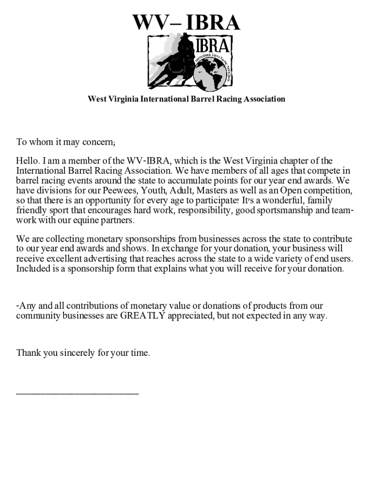 WV IBRAWest Virginia International Barrel Racing AssociationTo whom it may concern; Hello. I am a member of the WVIBRA, which is the West Virginia chapter of the International Barrel Racing Association.