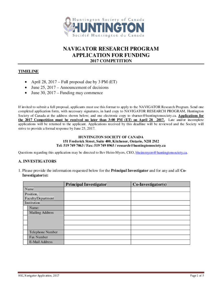NAVIGATOR RESEARCH PROGRAM APPLICATION FOR FUNDING 2017 COMPETITION TIMELINE April 28, 2017 Full proposal due by 3 PM (ET) June 25, 2017 Announcement of decisions June 30, 2017 Funding may commenceIf