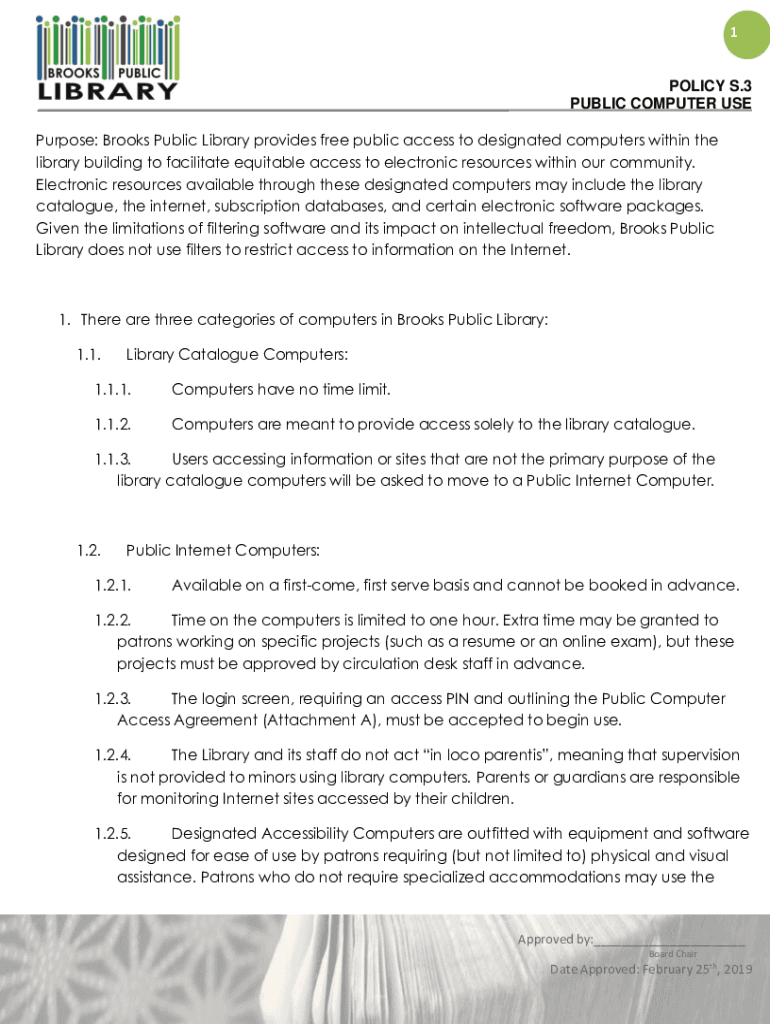 1 POLICY S.3 PUBLIC COMPUTER USE___Purpose: Brooks Public Library provides free public access to designated computers within the library building to facilitate equitable access to electronic resources