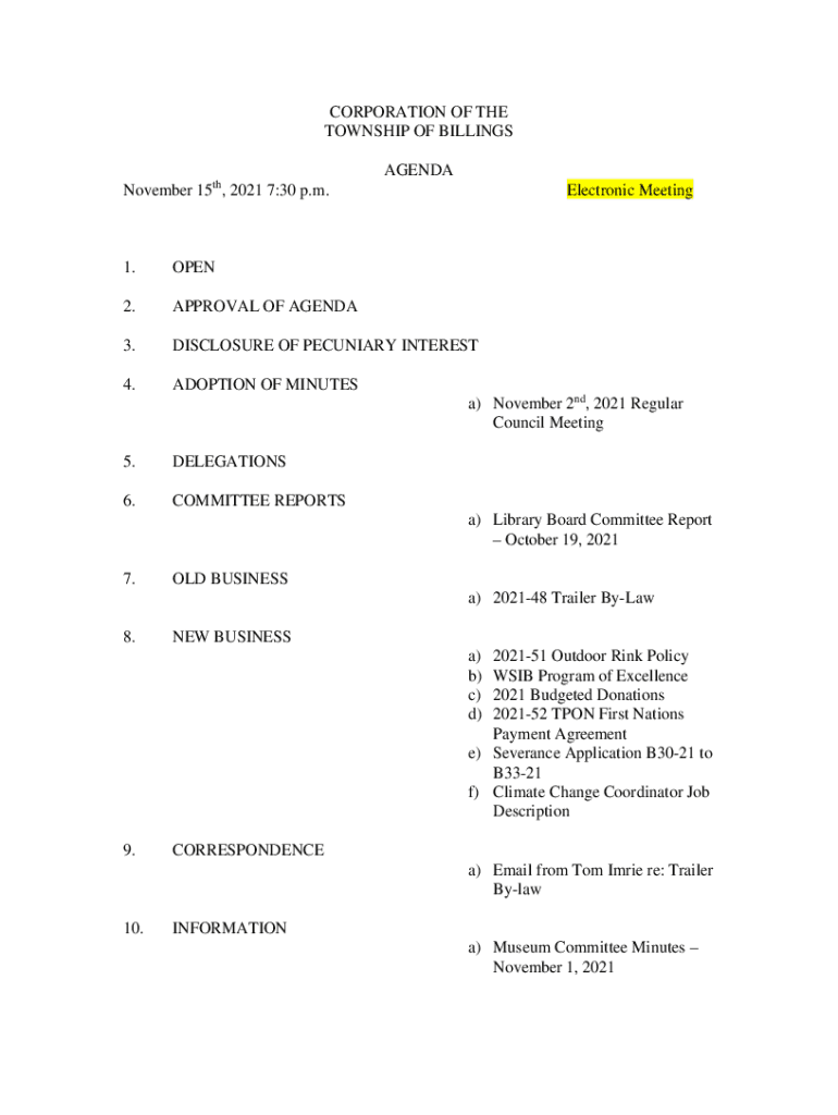 CORPORATION OF THE TOWNSHIP OF BILLINGS AGENDA November 15th, 2021 7:30 p.m.Electronic Meeting1.OPEN2.APPROVAL OF AGENDA3.DISCLOSURE OF PECUNIARY INTEREST4.ADOPTION OF MINUTES a) November 2nd, 2021