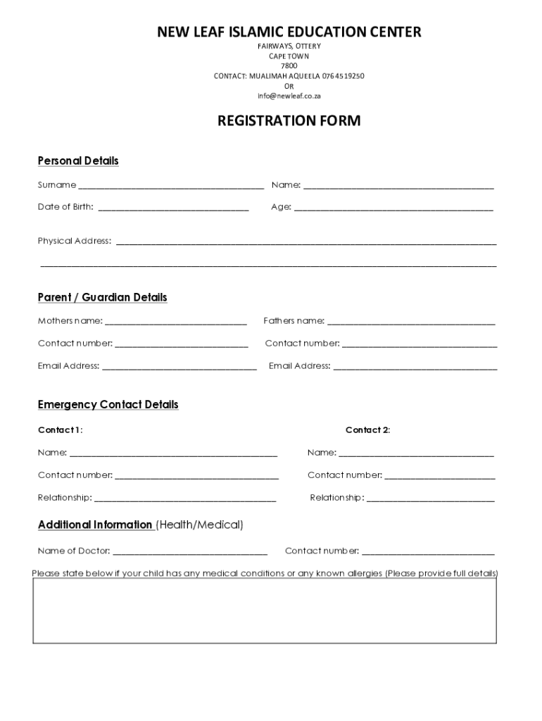 NEW LEAF ISLAMIC EDUCATION CENTERFAIRWAYS, OTTERYCAPE TOWN7800CONTACT: MUALIMAH AQUEELA 076 4519250ORinfo@newleaf.co.zaREGISTRATION FORMPersonal Details Surname ___ Name: ___ Date of Birth: ___Age: