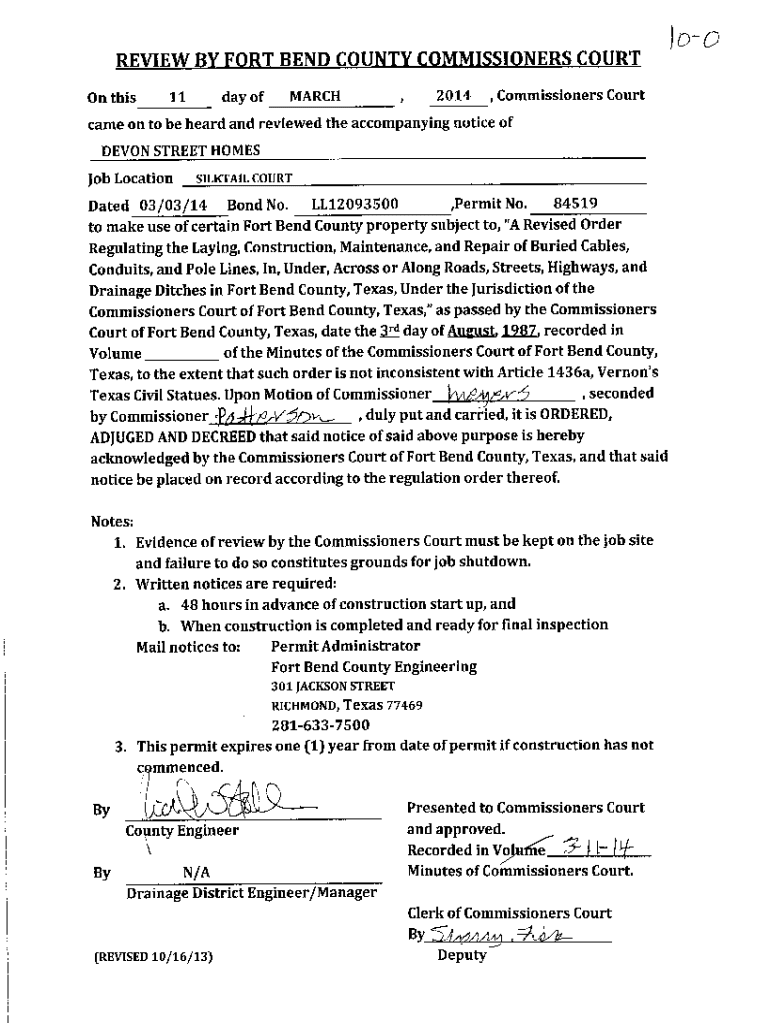 REVIEW BY FORT BEND COUNTY COMMISSIONERS COURTOnthis11day ofMARCH,2014 , Commissioners Courtcame on to be heard and reviewed the accompanying notice ofDEVON STREET HOMES Job Locationsilktail courtDated