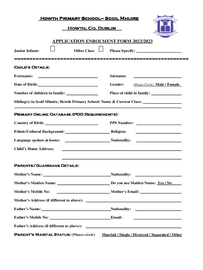 Howth Primary School School Scoil Mhuire Howth, Co. Dublin APPLICATION ENROLMENT FORM 2022/2023 Junior InfantsOther ClassPlease Specify: Childs Details: Details: Forename:Surname:Date of Birth:Gender:Number
