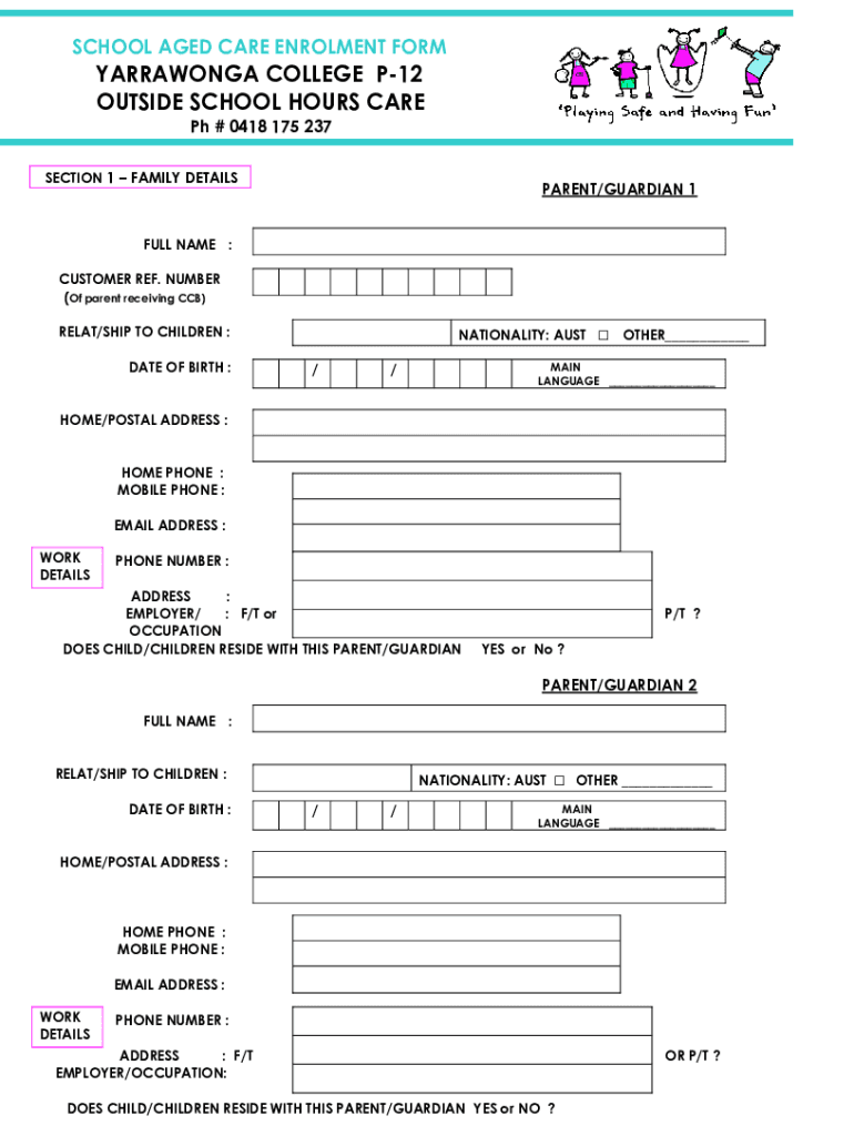 SCHOOL AGED CARE ENROLMENT FORMYARRAWONGA COLLEGE P12 OUTSIDE SCHOOL HOURS CARE Ph # 0418 175 237 SECTION 1 FAMILY DETAILSPARENT/GUARDIAN 1FULL NAME : CUSTOMER REF. NUMBER (Of parent receiving CCB)