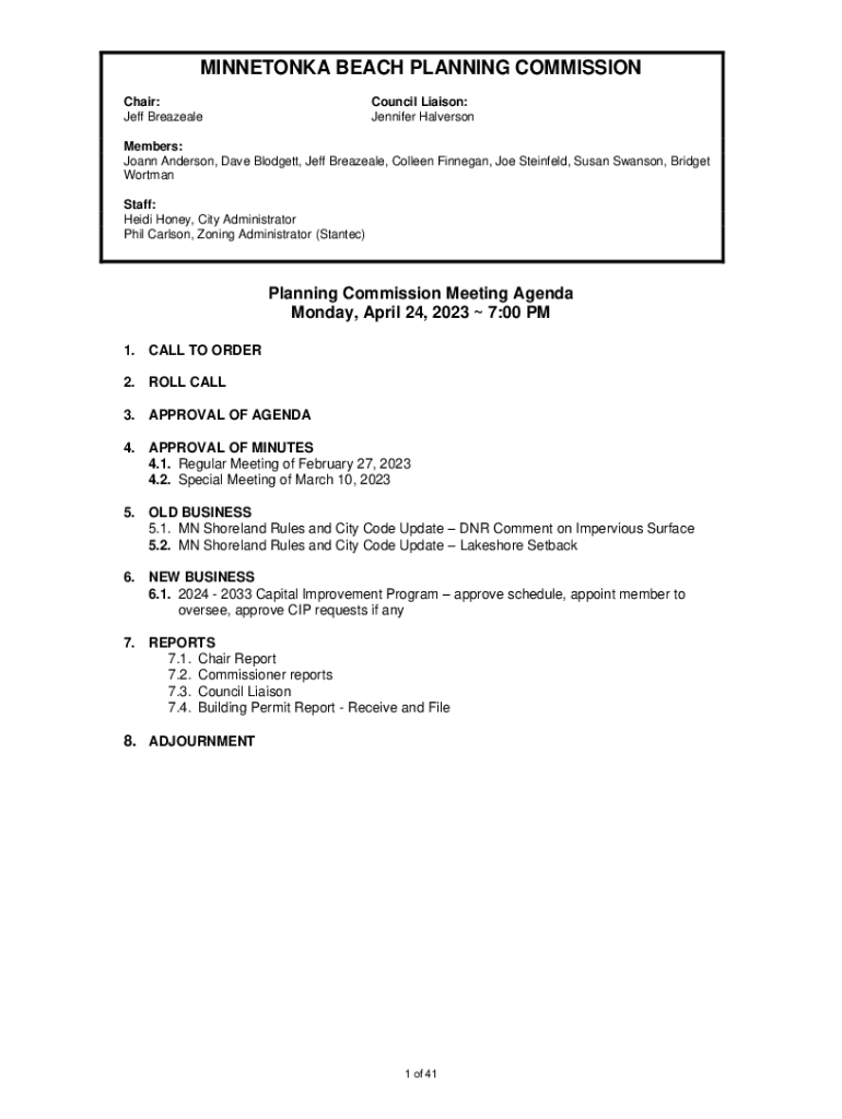 MINNETONKA BEACH PLANNING COMMISSION Chair: Jeff BreazealeCouncil Liaison: Jennifer HalversonMembers: Joann Anderson, Dave Blodgett, Jeff Breazeale, Colleen Finnegan, Joe Steinfeld, Susan Swanson,