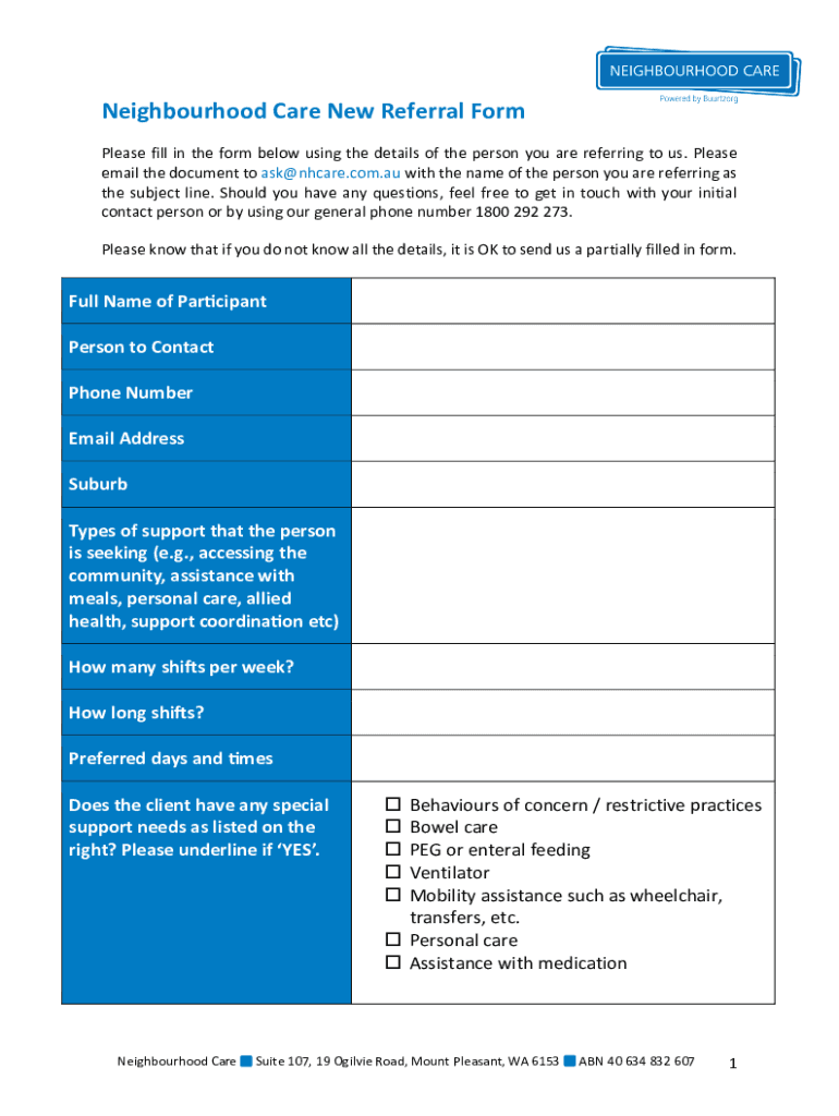 Neighbourhood Care New Referral Form Please fill in the form below using the details of the person you are referring to us. Please email the document to ask@nhcare.com.au with the name of the person