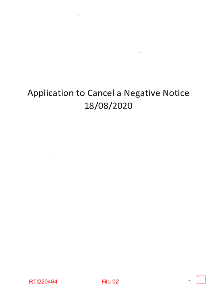 Application to Cancel a Negative Notice 18/08/2020RTI220464File 021Rdistribute, print or copy this email without appropriate authority. If you are not the Intended addressee and this message has been
