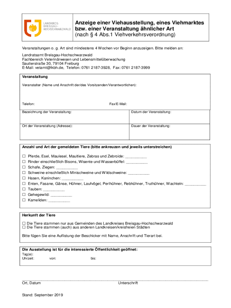 Anzeige einer Viehausstellung, eines Viehmarktes bzw. einer Veranstaltung hnlicher Art (nach 4 Abs.1 Viehverkehrsverordnung) Veranstaltungen o. g. Art sind mindestens 4 Wochen vor Beginn anzuzeigen.