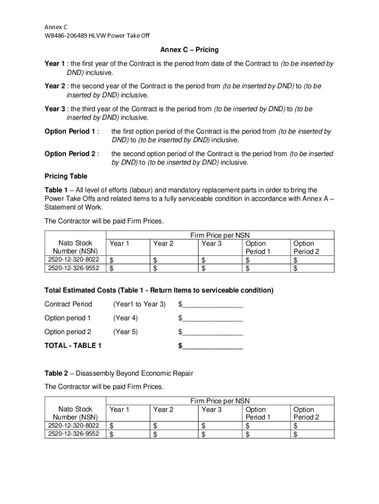 Annex C W8486206489 HLVW Power Take Off Annex C Pricing Year 1 : the first year of the Contract is the period from date of the Contract to (to be inserted by DND) inclusive. Year 2 : the second year