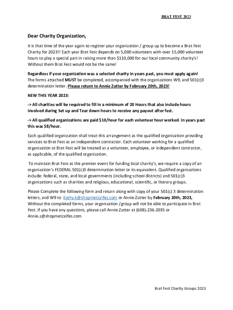 BRAT FEST 2023Dear Charity Organization, It is that time of the year again to register your organization / group up to become a Brat Fest Charity for 2023!! Each year Brat Fest depends on 5,000 volunteers