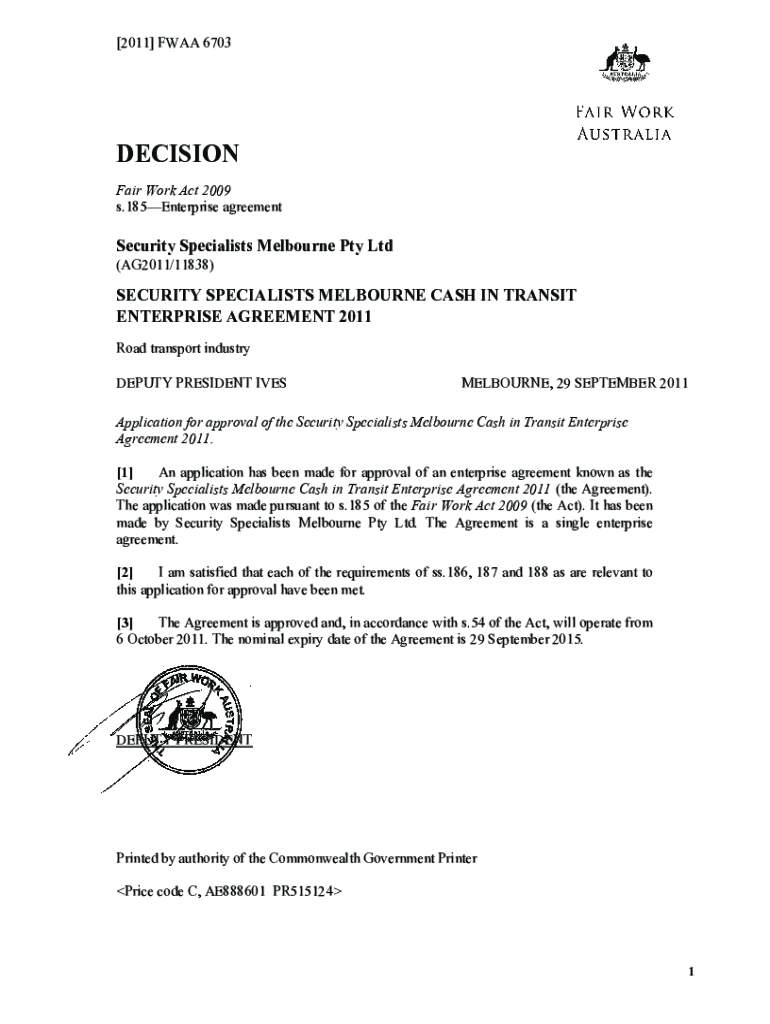 [2011] FWAA 6703DECISION Fair Work Act 2009 s.185Enterprise agreementSecurity Specialists Melbourne Pty Ltd (AG2011/11838)SECURITY SPECIALISTS MELBOURNE CASH IN TRANSIT ENTERPRISE AGREEMENT 2011 Road