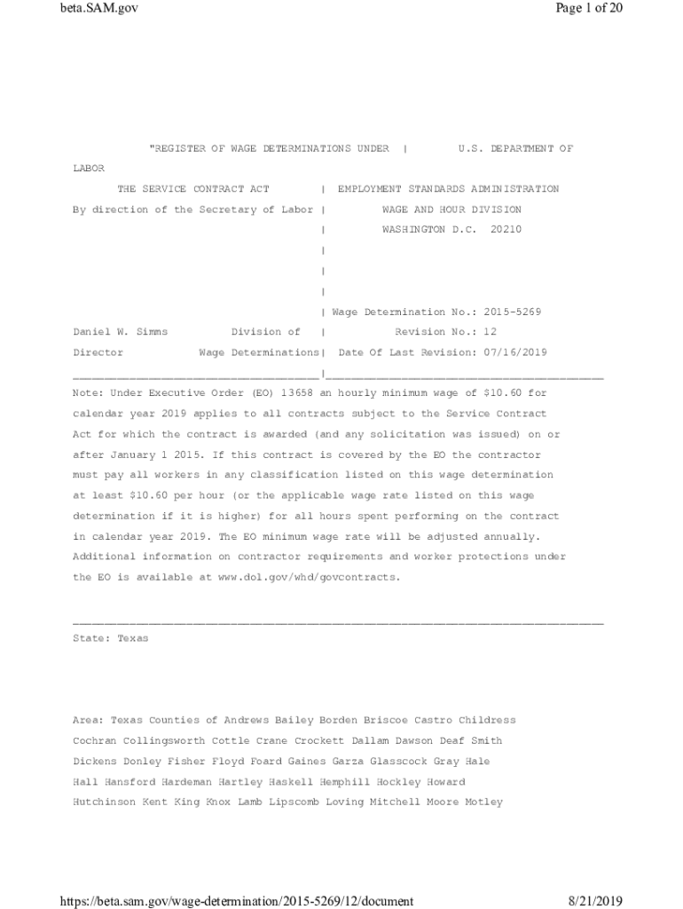 beta.SAM.govPage 1 of 20\"REGISTER OF WAGE DETERMINATIONS UNDER|U.S. DEPARTMENT OFLABOR THE SERVICE CONTRACT ACT|By direction of the Secretary of Labor | |EMPLOYMENT STANDARDS ADMINISTRATION WAGE