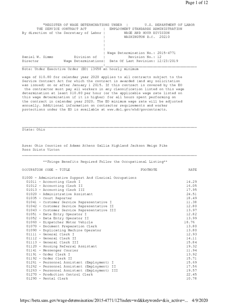 Page 1 of 12\"REGISTER OF WAGE DETERMINATIONS UNDER | U.S. DEPARTMENT OF LABOR THE SERVICE CONTRACT ACT | EMPLOYMENT STANDARDS ADMINISTRATION By direction of the Secretary of Labor | WAGE AND HOUR