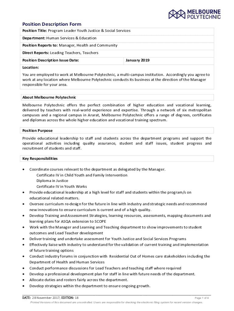 Position Description Form Position Title: Program Leader Youth Justice & Social Services Department: Human Services & Education Position Reports to: Manager, Health and Community Direct Reports: Leading