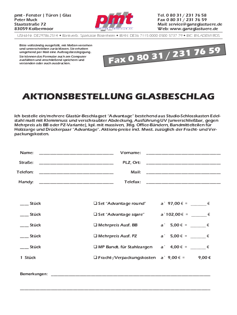 pmt Fenster | Tren | Glas Peter Muck Staatsstrae 72 83059 KolbermoorTel. 0 80 31 / 231 76 58 Fax 0 80 31 / 231 76 59 Mail: service@ganzglastuere.de Web: www.ganzglastuere.deUStIdNr. DE297862514 Bankverb.: