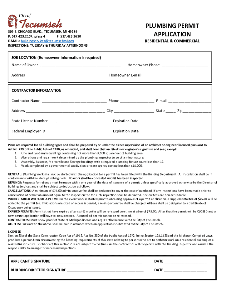 PLUMBING PERMIT APPLICATION309 E. CHICAGO BLVD., TECUMSEH, MI 49286 P: 517.423.2107, press 4 F: 517.423.3610 EMAIL: buildingservices@tecumsehmi.gov INSPECTIONS: TUESDAY & THURSDAY AFTERNOONSRESIDENTIAL
