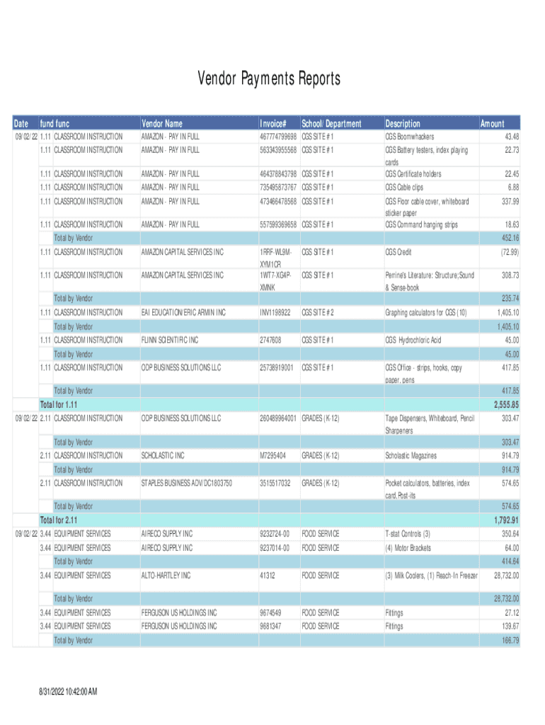 Vendor Payments Reports Datefund funcVendor NameInvoice#School/DepartmentDescription09/02/22 1.11 CLASSROOM INSTRUCTION 1.11 CLASSROOM INSTRUCTIONAMAZON PAY IN FULL AMAZON PAY IN FULL467774799698