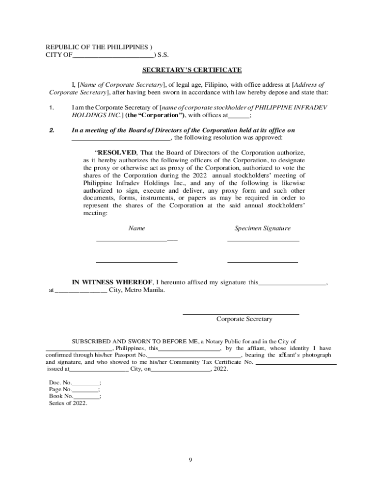 REPUBLIC OF THE PHILIPPINES ) CITY OF ___) S.S. SECRETARYS CERTIFICATE I, [Name of Corporate Secretary], of legal age, Filipino, with office address at [Address of Corporate Secretary], after having