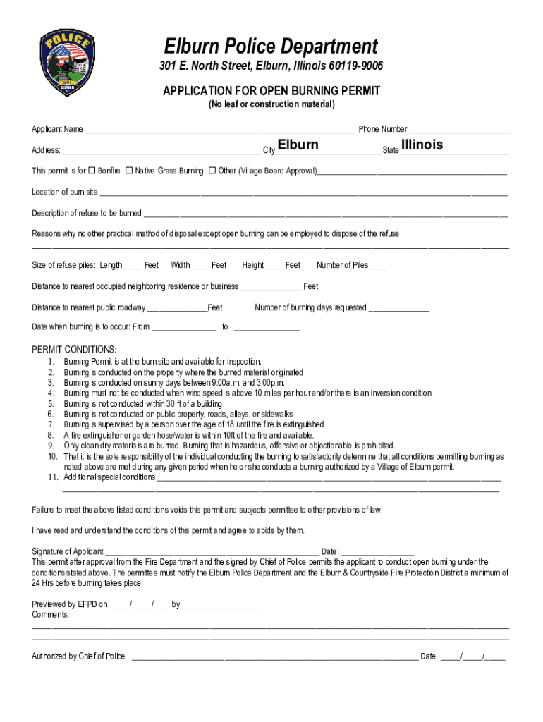 Elburn Police Department 301 E. North Street, Elburn, Illinois 601199006 APPLICATION FOR OPEN BURNING PERMIT (No leaf or construction material) Applicant Name ___ Phone Number ___Elburn Illinois Address: