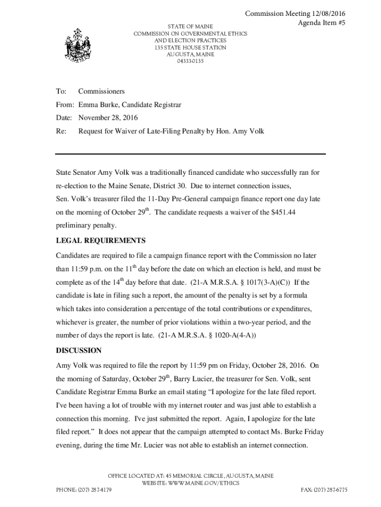 Commission Meeting 12/08/2016 Agenda Item #5STATE OF MAINE COMMISSION ON GOVERNMENTAL ETHICS AND ELECTION PRACTICES 135 STATE HOUSE STATION AUGUSTA, MAINE 043330135To:CommissionersFrom: Emma Burke,