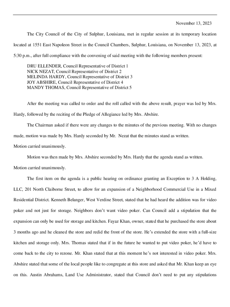 November 13, 2023 The City Council of the City of Sulphur, Louisiana, met in regular session at its temporary location located at 1551 East Napoleon Street in the Council Chambers, Sulphur, Louisiana,