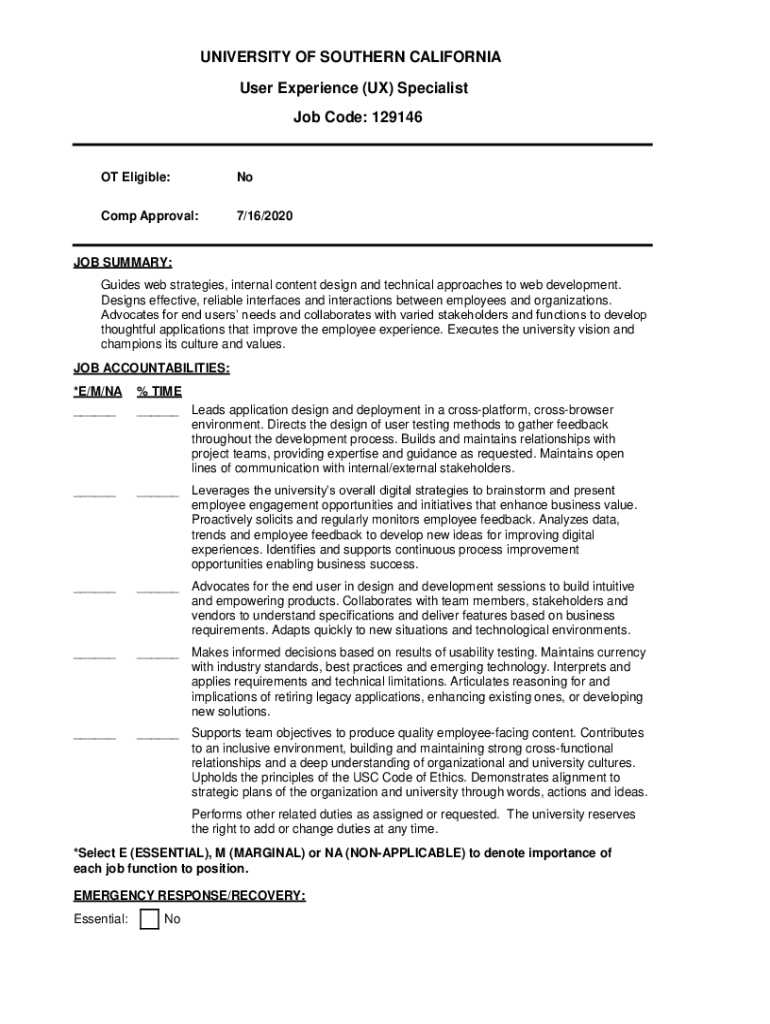 UNIVERSITY OF SOUTHERN CALIFORNIA User Experience (UX) Specialist Job Code: 129146OT Eligible:NoComp Approval:7/16/2020JOB SUMMARY: Guides web strategies, internal content design and technical approaches
