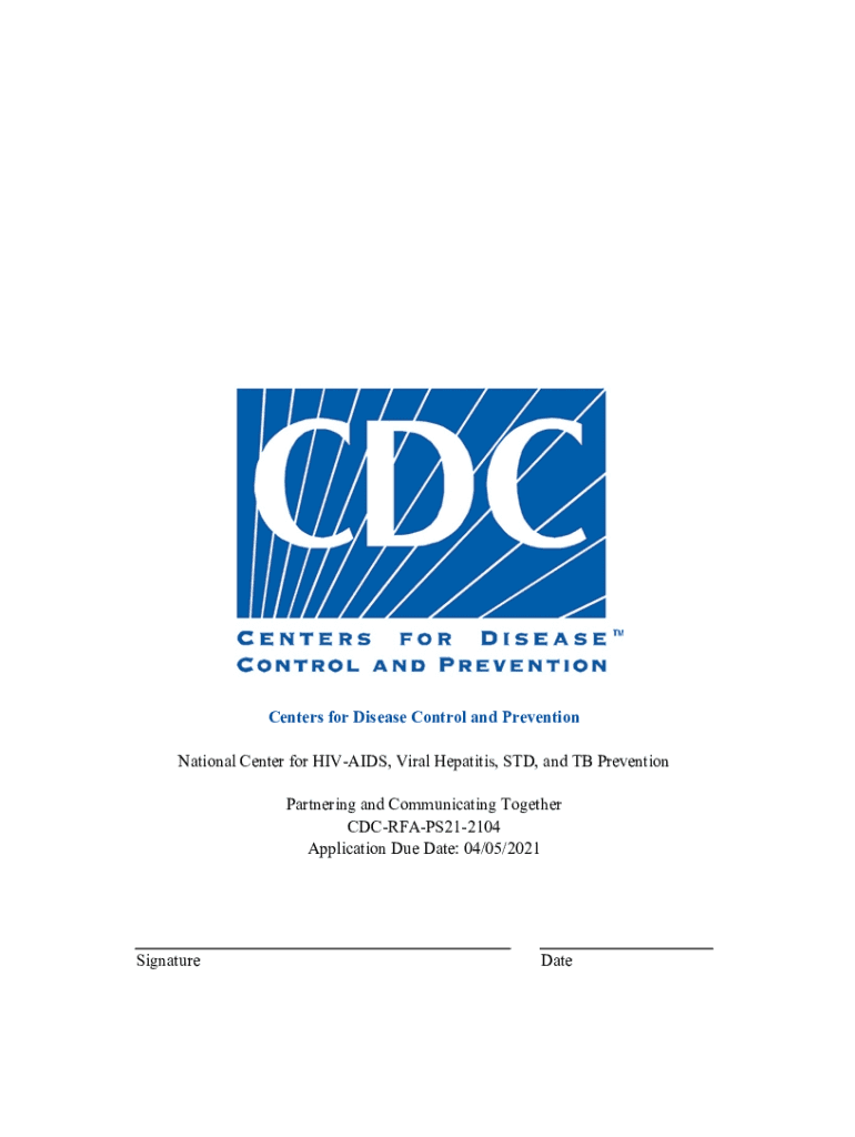 Centers for Disease Control and Prevention National Center for HIVAIDS, Viral Hepatitis, STD, and TB Prevention Partnering and Communicating Together CDCRFAPS212104 Application Due Date: 04/05/2021SignatureDatePartnering