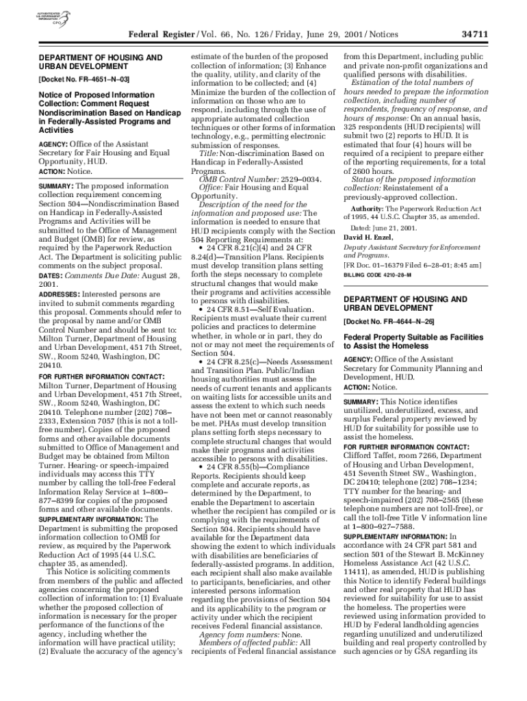 Federal Register / Vol. 66, No. 126 / Friday, June 29, 2001 / Notices DEPARTMENT OF HOUSING AND URBAN DEVELOPMENT [Docket No. FR4651N03]Notice of Proposed Information Collection: Comment Request Nondiscrimination