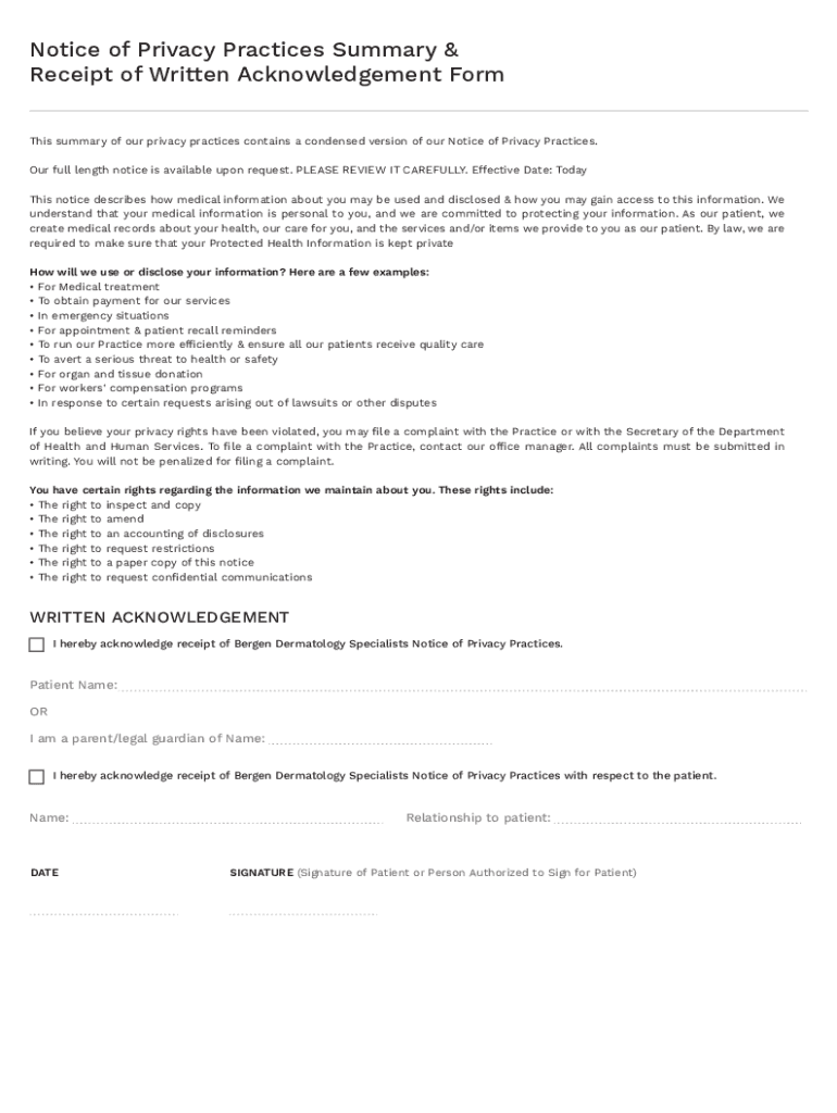 Notice of Privacy Practices Summary & Receipt of Written Acknowledgement Form This summary of our privacy practices contains a condensed version of our Notice of Privacy Practices. Our full length