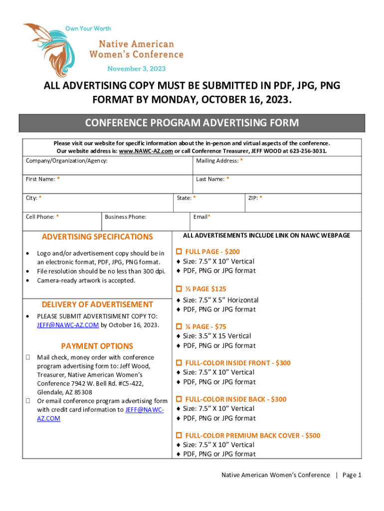 ALL ADVERTISING COPY MUST BE SUBMITTED IN PDF, JPG, PNG FORMAT BY MONDAY, OCTOBER 16, 2023. CONFERENCE PROGRAM ADVERTISING FORM Please visit our website for specific information about the inperson