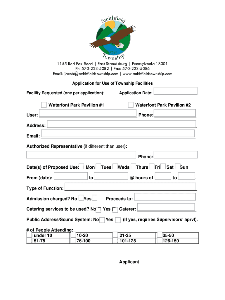 1155 Red Fox Road | East Stroudsburg | Pennsylvania 18301 Ph: 5702235082 | Fax: 5702235086 Email: jacob@smithfieldtownship.com | www.smithfieldtownship.com Application for Use of Township Facilities