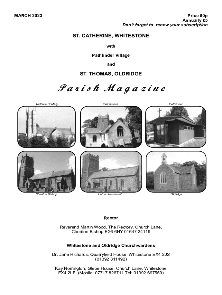 MARCH 2023Price 50p Annually 5 Dont forget to renew your subscriptionST. CATHERINE, WHITESTONE with Pathfinder Village andST. THOMAS, OLDRIDGEParish Magazine Tedburn St MaryCheriton BishopWhitestonePathfinderHolcombe