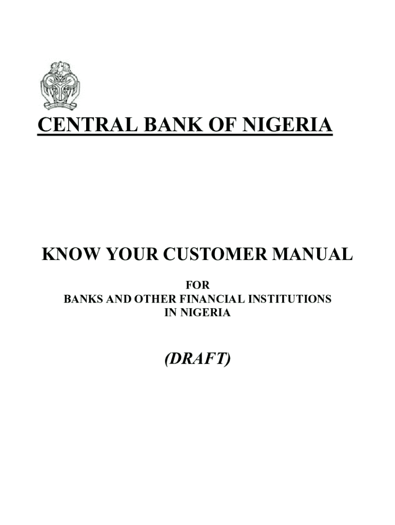 CENTRAL BANK OF NIGERIAKNOW YOUR CUSTOMER MANUAL FOR BANKS AND OTHER FINANCIAL INSTITUTIONS IN NIGERIA(DRAFT)K N OW Y OU R CU ST OM ER M AN U AL (K Y CM ) FOR BAN K S AN D OT H ER FI N AN CI AL I