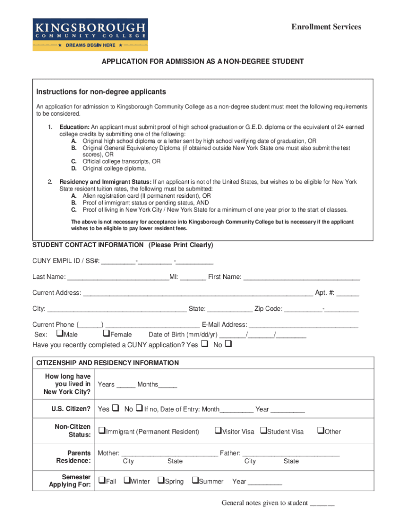Enrollment ServicesAPPLICATION FOR ADMISSION AS A NONDEGREE STUDENTInstructions for nondegree applicants An application for admission to Kingsborough Community College as a nondegree student must