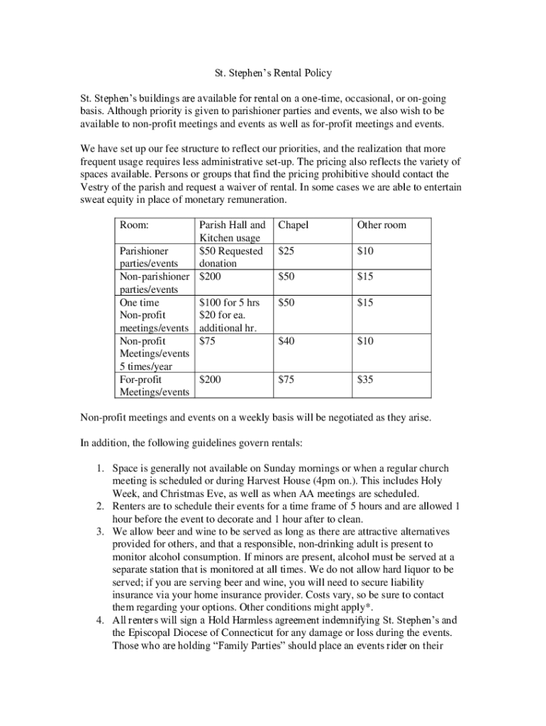 St. Stephens Rental Policy St. Stephens buildings are available for rental on a onetime, occasional, or ongoing basis. Although priority is given to parishioner parties and events, we also wish to