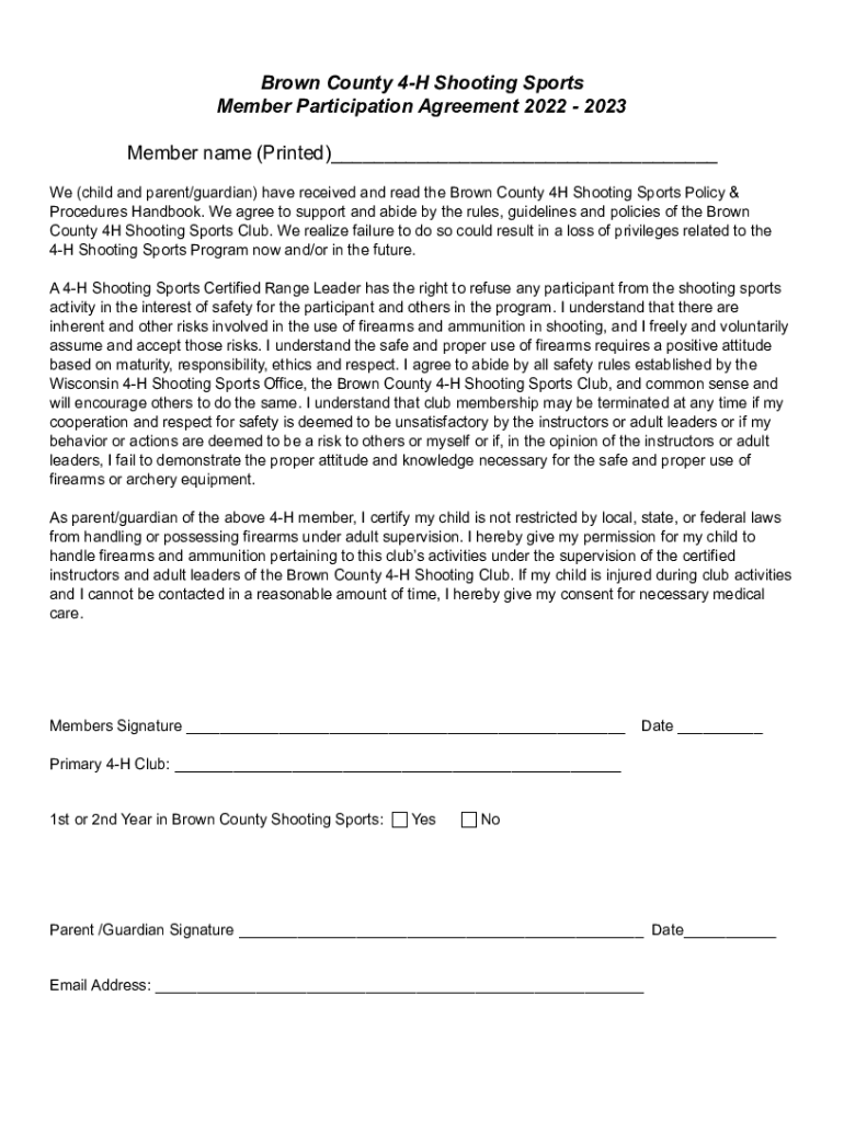 Brown County 4H Shooting Sports Member Participation Agreement 2022 2023 Member name (Printed)___ We (child and parent/guardian) have received and read the Brown County 4H Shooting Sports Policy &