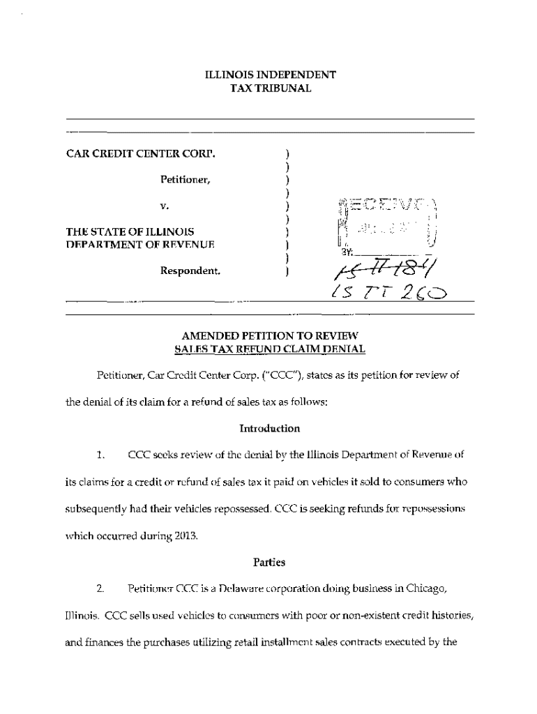 ILLINOIS INDEPENDENT TAX TRIBUNALCAR CREDIT CENTER CORP.) ) ) ) ) ) ) ) ) )Petitioner,v. THE STATE OF ILLINOIS DEPARTMENT OF REVENUE Respondent.BY: _ _ _ _ _ _ _/ l7z\'8 ?/ isrr 2c:.oAMENDED PETITION
