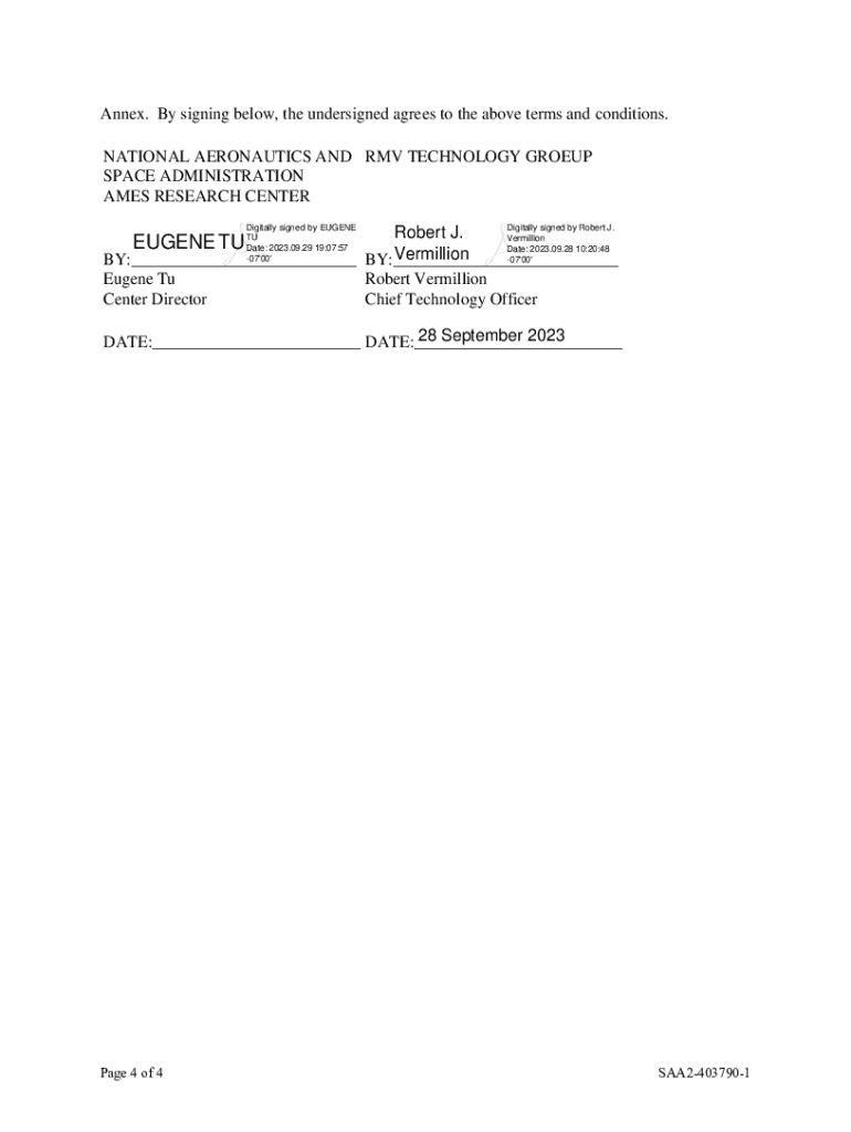 ANNEX 1 BETWEEN THE NATIONAL AERONAUTICS AND SPACE ADMINISTRATION AMES RESEARCH CENTER AND RMV TECHNOLOGY GROUP UNDER SPACE ACT UMBRELLA AGREEMENT SAA2403790, DATED UPON FINAL SIGNATURE (ANNEX ONE).