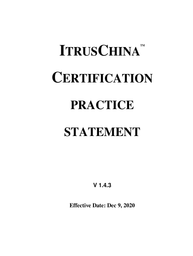 TMITRUSCHINACERTIFICATION PRACTICE STATEMENTV 1.4.3Effective Date: Dec 9, 2020Version Description: iTrusChina Certification Practice Statement Version Control table Name & VersionMain Revision DescriptionCompletion