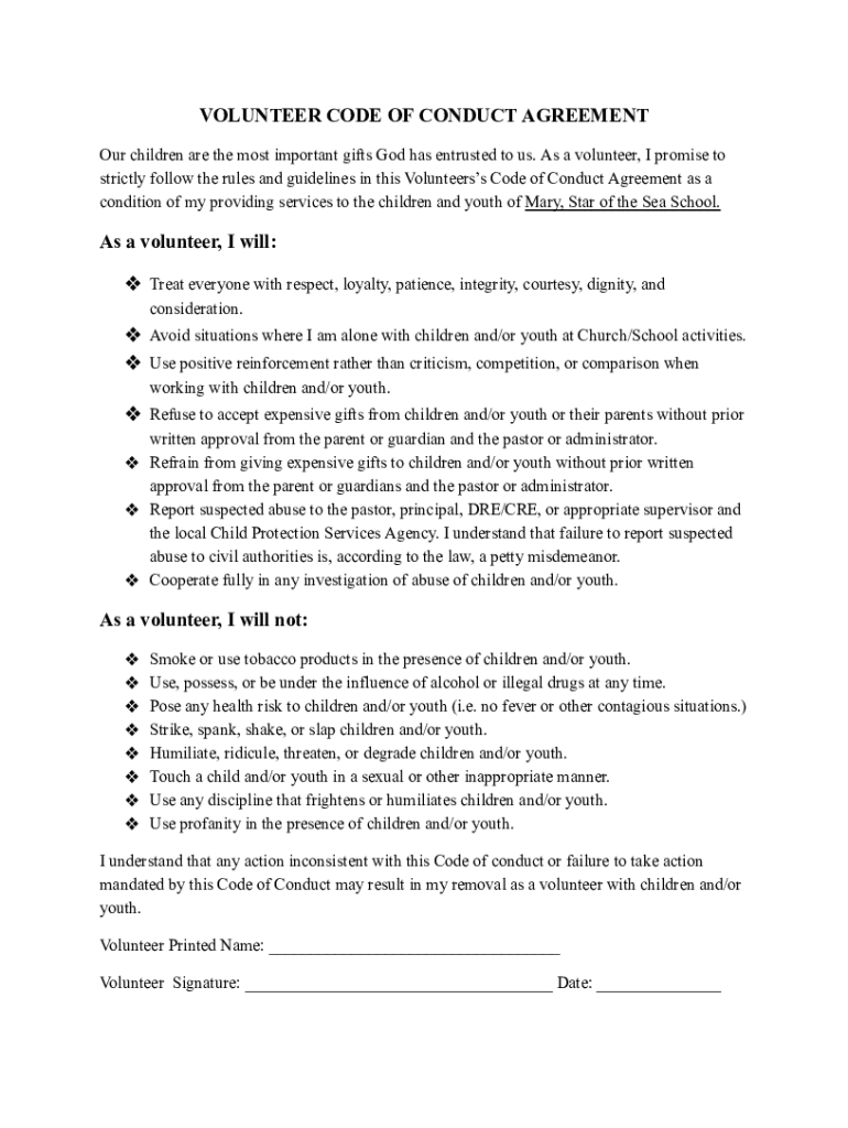 VOLUNTEER CODE OF CONDUCT AGREEMENT Our children are the most important gifts God has entrusted to us. As a volunteer, I promise to strictly follow the rules and guidelines in this Volunteerss Code