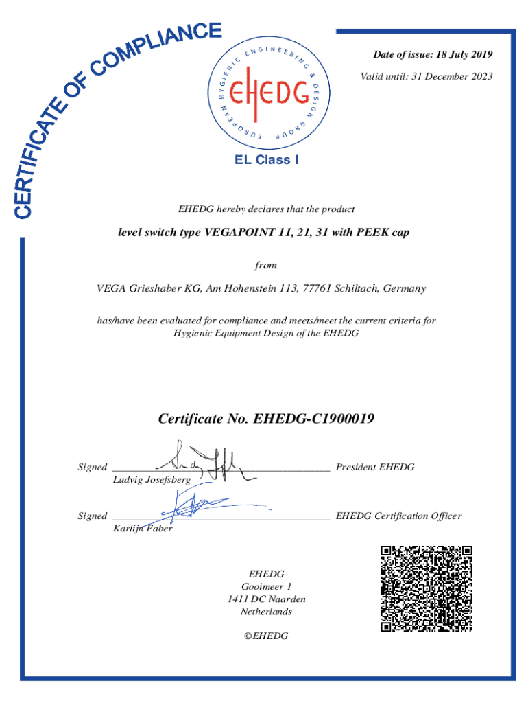 Date of issue: 18 July 2019 Valid until: 31 December 2023EL Class IEHEDG hereby declares that the productlevel switch type VEGAPOINT 11, 21, 31 with PEEK cap from VEGA Grieshaber KG, Am Hohenstein