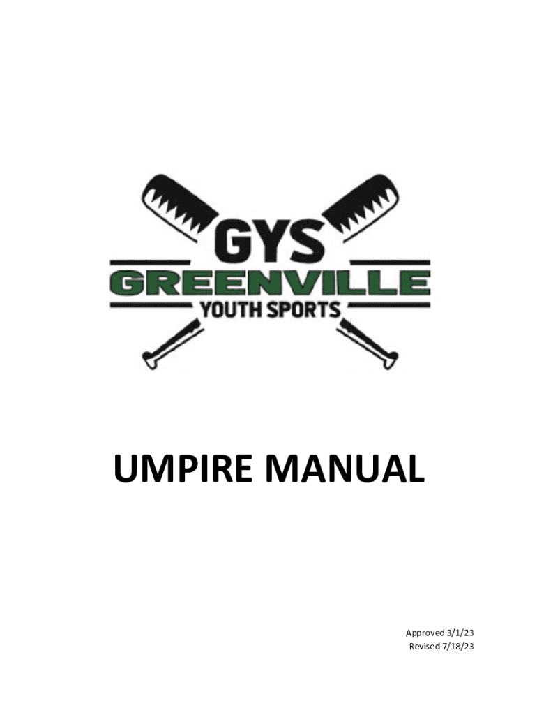 UMPIRE MANUALApproved 3/1/23 Revised 7/18/23Table of Contents General Information .. 3 Game Balls ... 4 Rules .... 4 Pregame Meeting ...... 5 Umpire