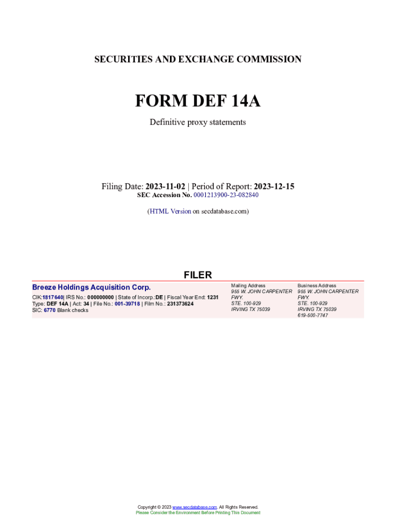 Get the free Breeze Holdings Acquisition Corp. Form DEF 14A Filed 2023-11-02. Accession Number