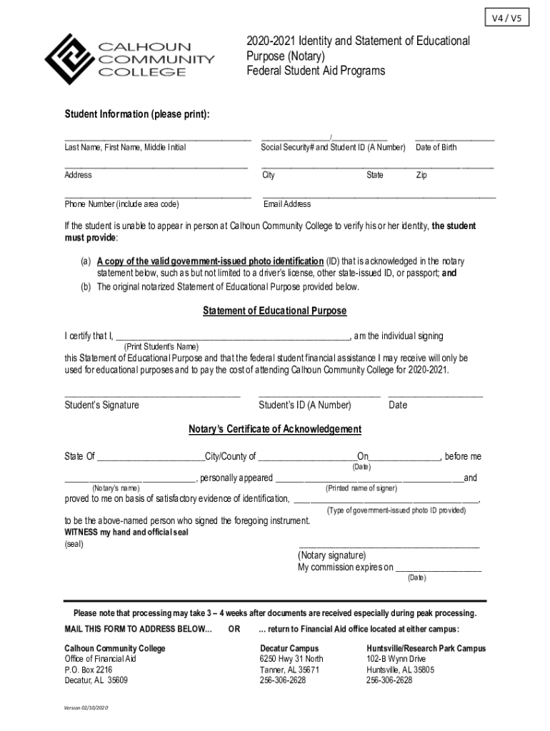 V4 / V520202021 Identity and Statement of Educational Purpose (Notary) Federal Student Aid Programs Student Information (please print): ______/______Last Name, First Name, Middle InitialSocial Security#