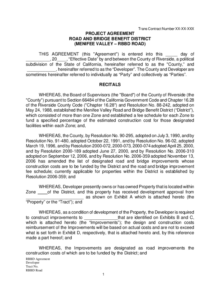 Trans Contract Number XXXXXXXPROJECT AGREEMENT ROAD AND BRIDGE BENEFIT DISTRICT (MENIFEE VALLEY RBBD ROAD) THIS AGREEMENT (this \"Agreement\") is entered into this ___ day of ___, 20___, Effective