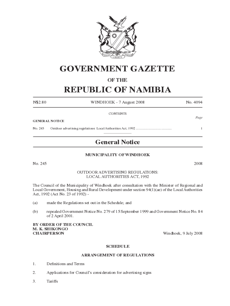 GOVERNMENT GAZETTE OF THEREPUBLIC OF NAMIBIA N$2.80WINDHOEK 7 August 2008No. 4094CONTENTSPageGENERAL NOTICE No. 245Outdoor advertising regulations: Local Authorities Act, 1992 .............................