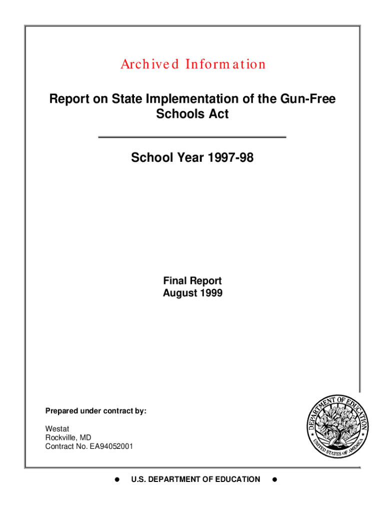Archived Information Report on State Implementation of the GunFree Schools Act School Year 199798Final Report August 1999Prepared under contract by: Westat Rockville, MD Contract No. EA94052001U.S.