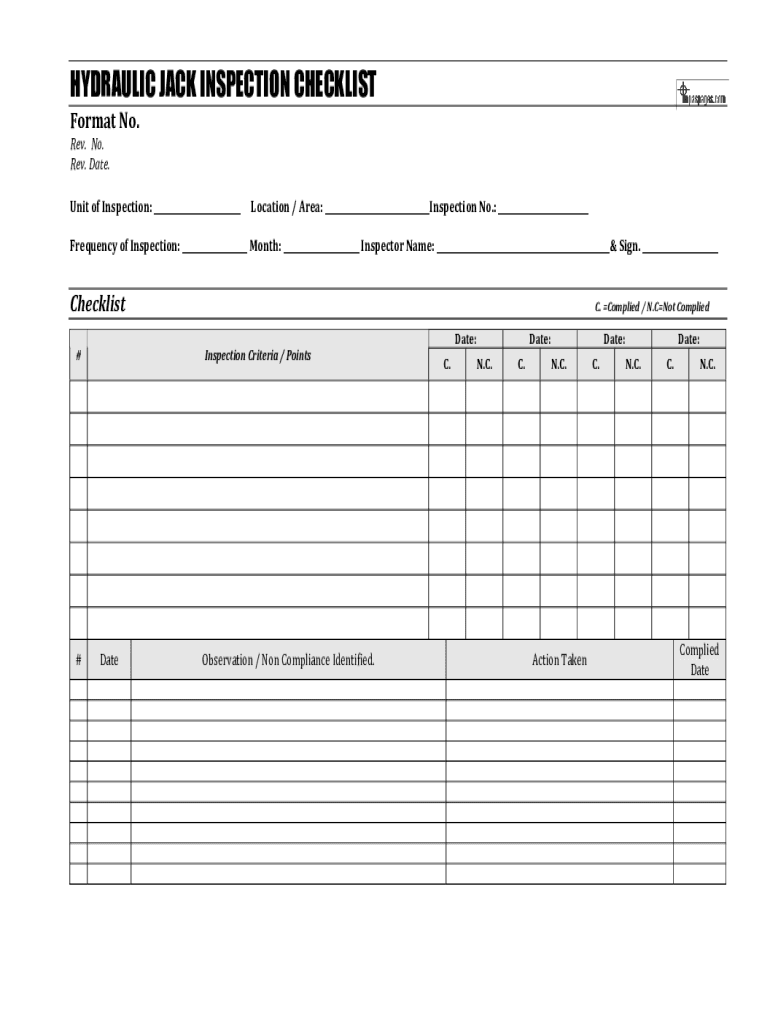 HYDRAULIC JACK INSPECTION CHECKLIST Format No. Rev. No. Rev. Date. Unit of Inspection: ___Location / Area: ___Inspection No.: ___Frequency of Inspection: ___ Month: ___ Inspector Name: ___& Sign.